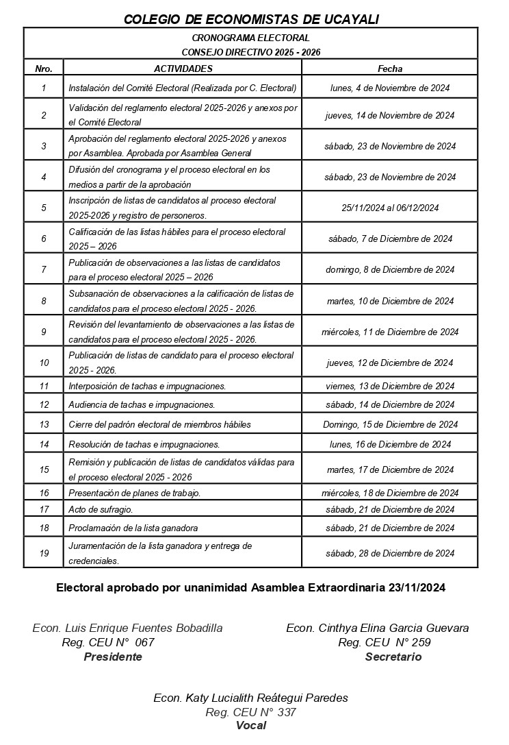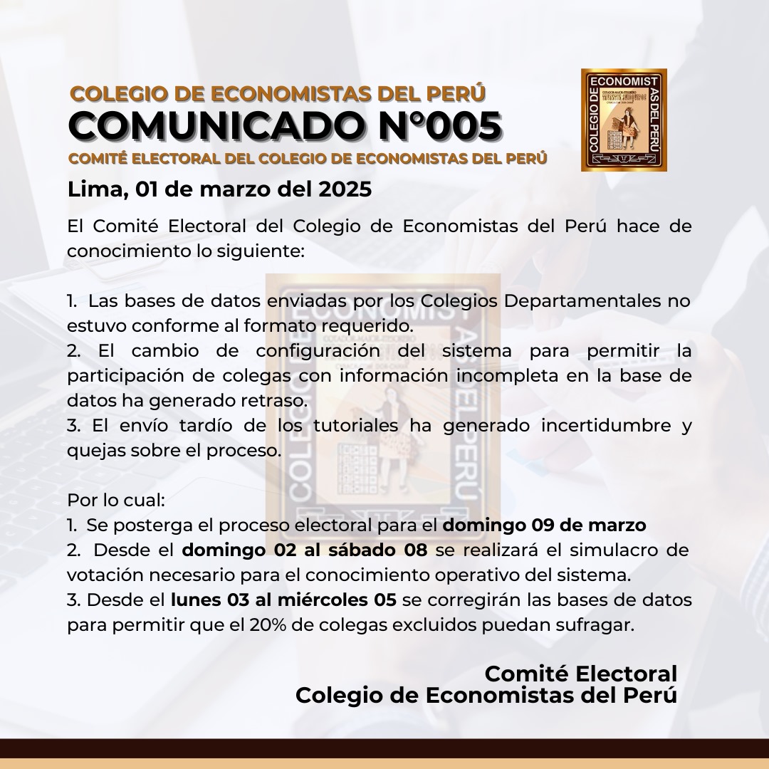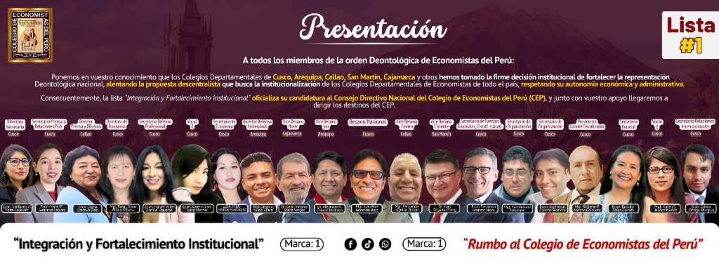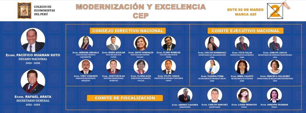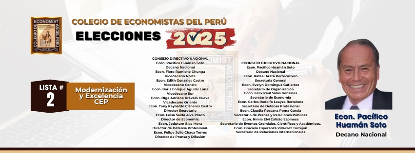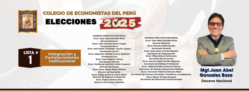 El 2 de marzo se desarrollarán las elecciones del nuevo decano del Colegio de Economistas del Perú y para ello se pone en conocimiento las dos listas inscritas. El padrón de electores corresponde a los hábiles con fecha de corte 31/12/2024.