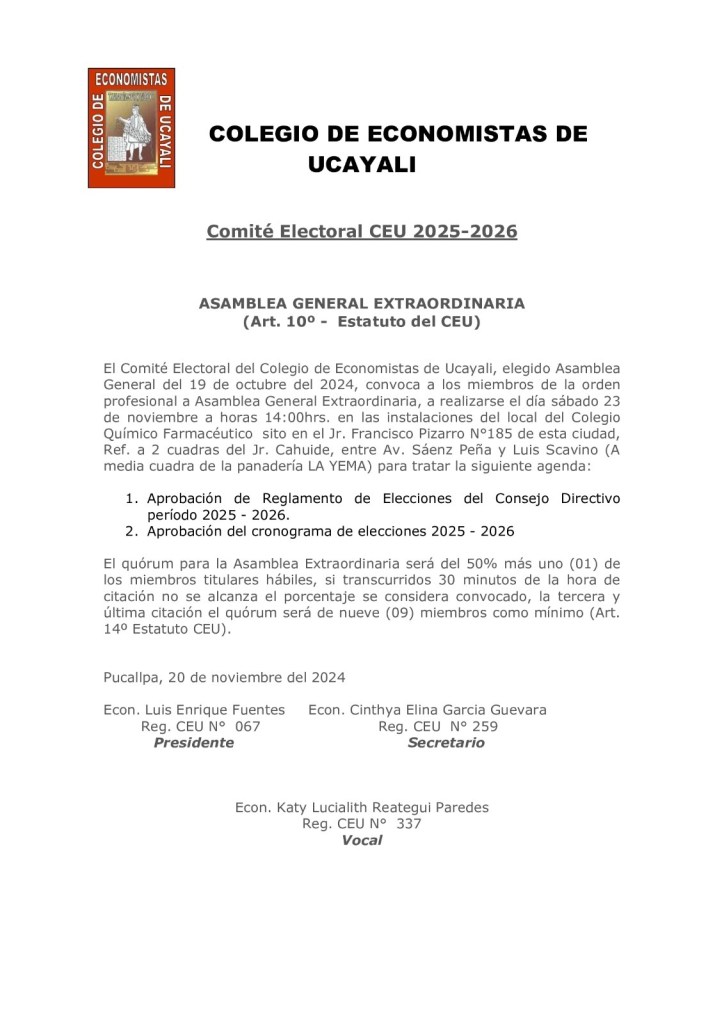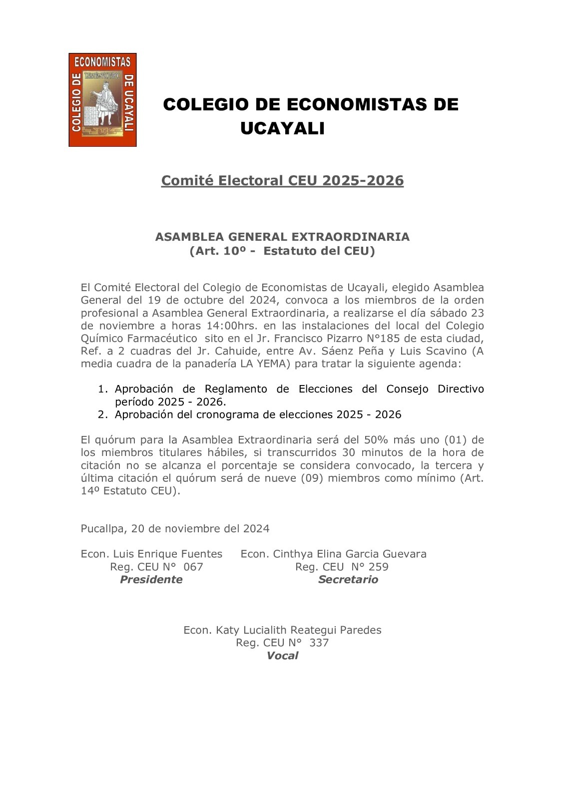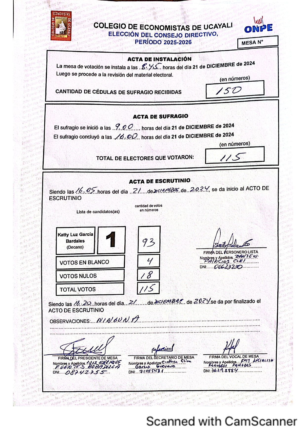 El 2 de marzo se desarrollarán las elecciones del nuevo decano del Colegio de Economistas del Perú y para ello se pone en conocimiento las dos listas inscritas. El padrón de electores corresponde a los hábiles con fecha de corte 31/12/2024.